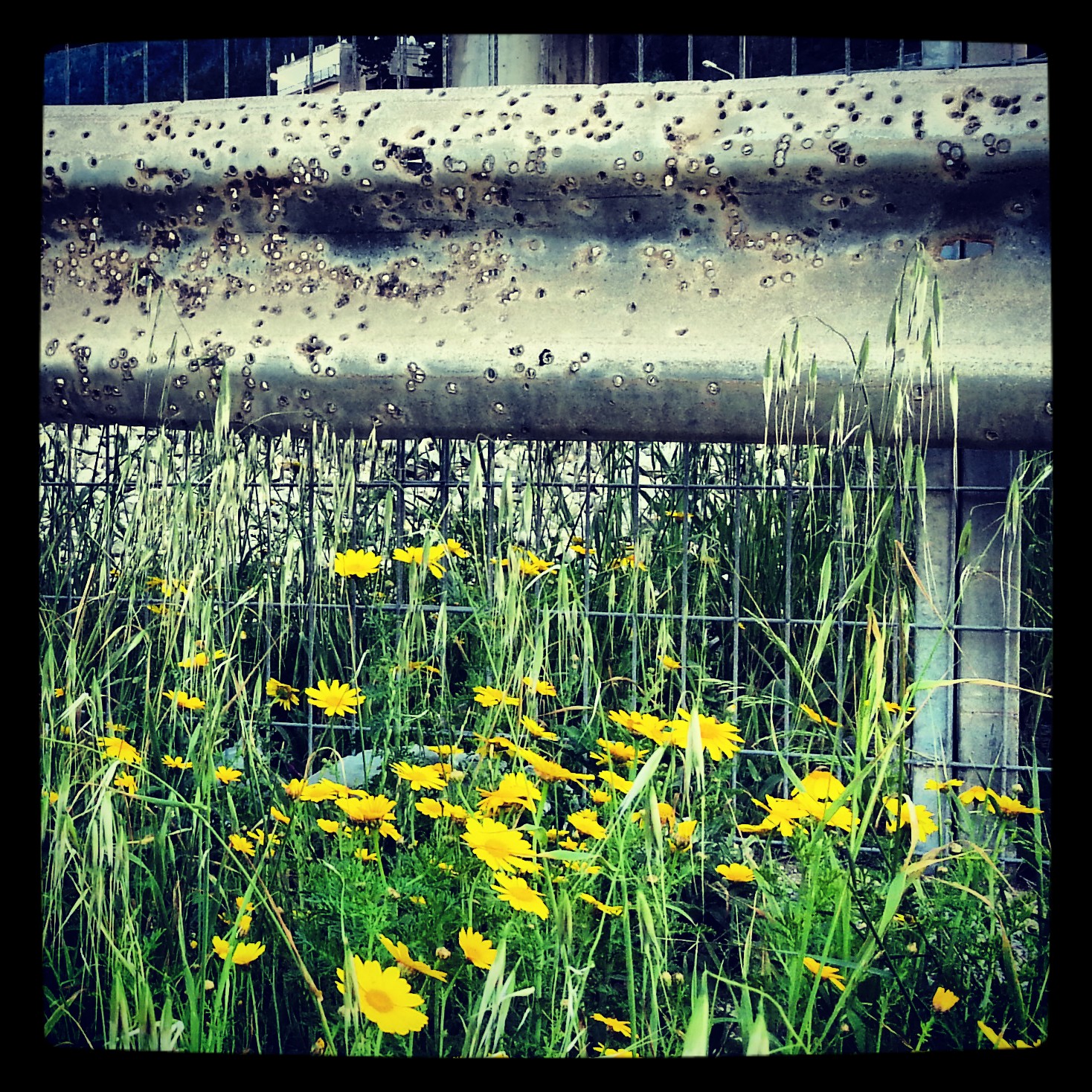 Most of the damage from that war was repaired immediately. This seldom noticed spot was not. Flowers have grown next to it but the signs of the destruction scream out to anyone who bothers to look.