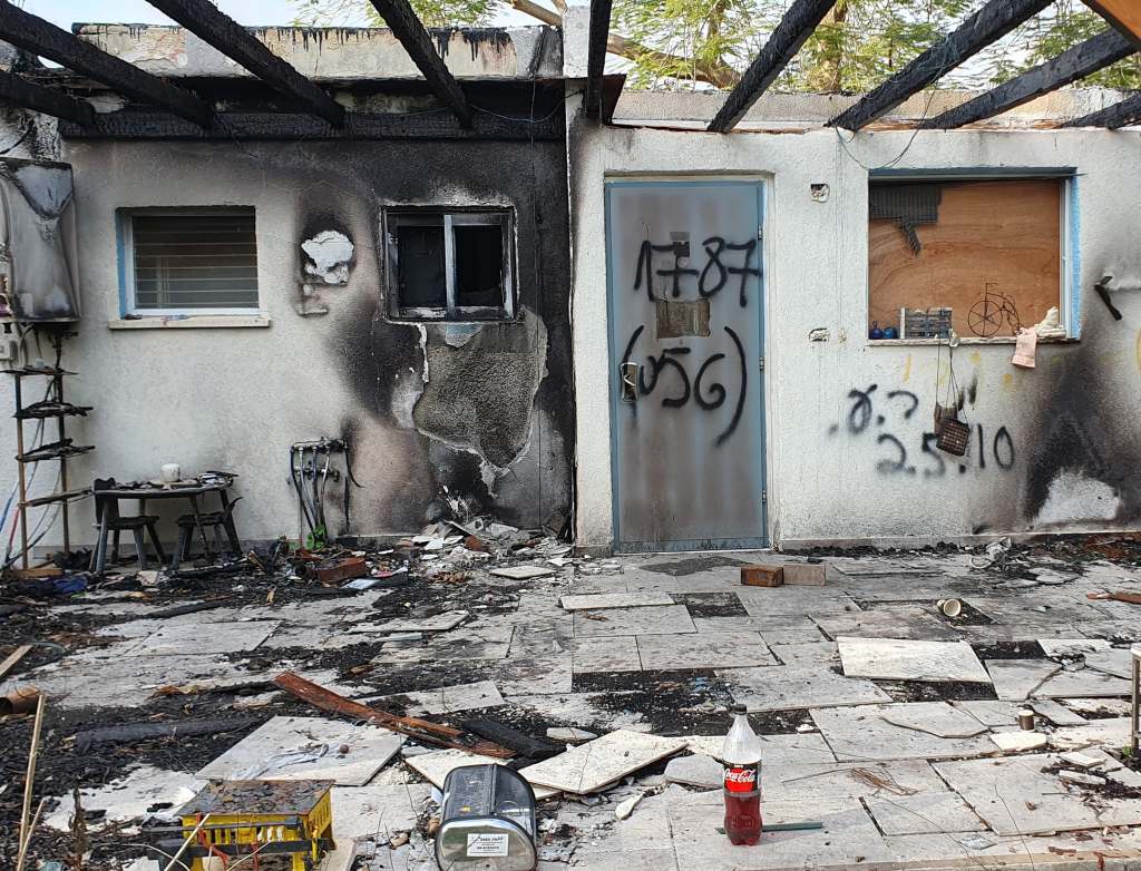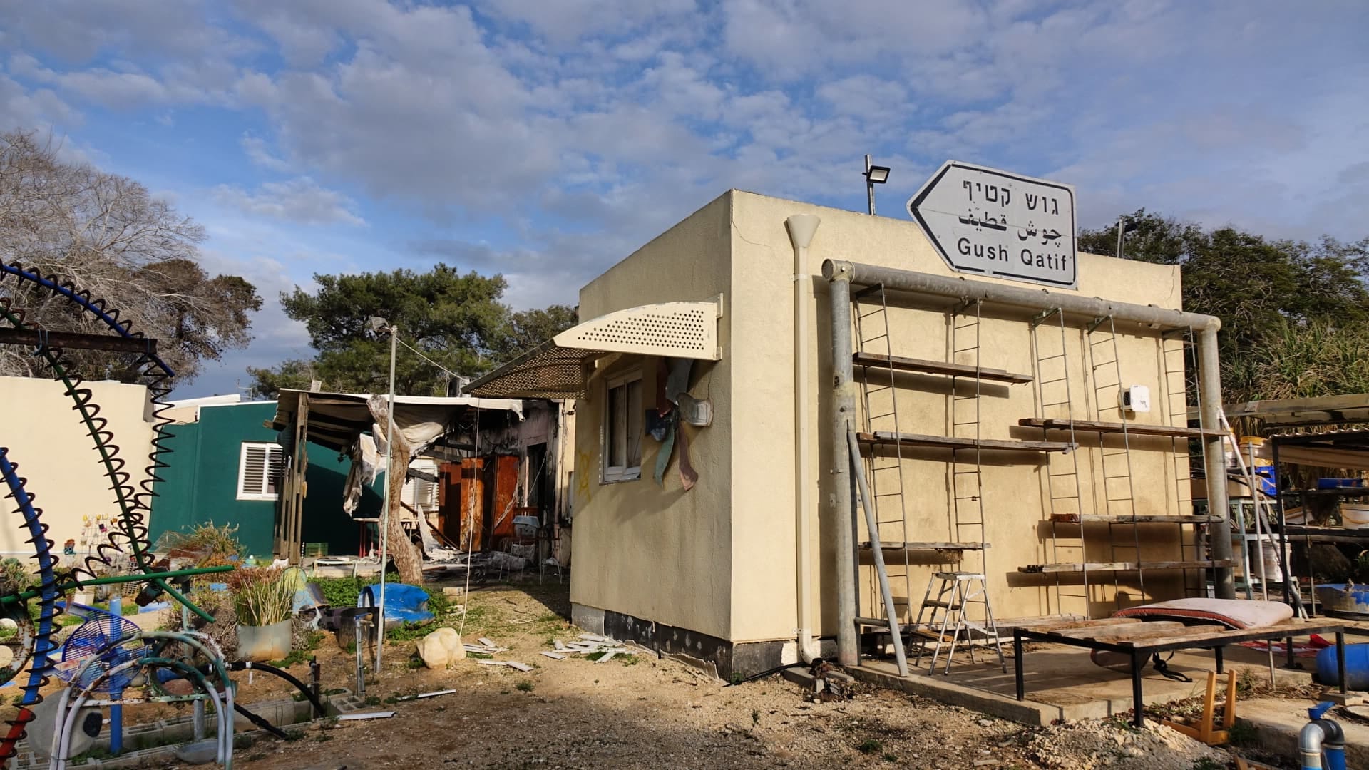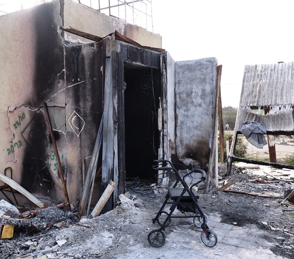 The frame of a Sukkah still standing, a seesaw for kids to play with, a professional BBQ grill and oven… signs of happy family life, amid destruction.