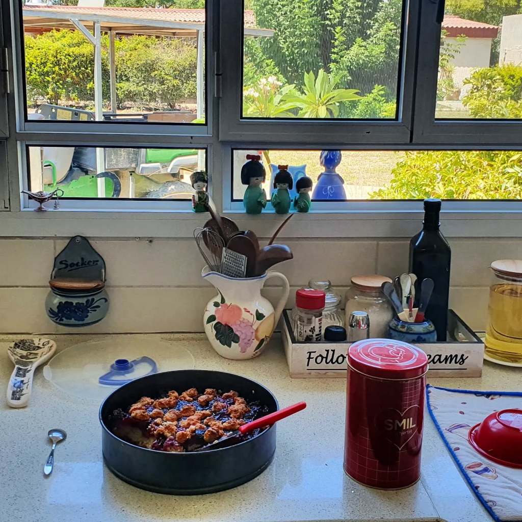 What could feel more home-like? A perfect tableau: a freshly baked pie, charming knick-knacks, and the peaceful greenery outside the kitchen window… an incomprehensible contrast to what my mind knows happened here.